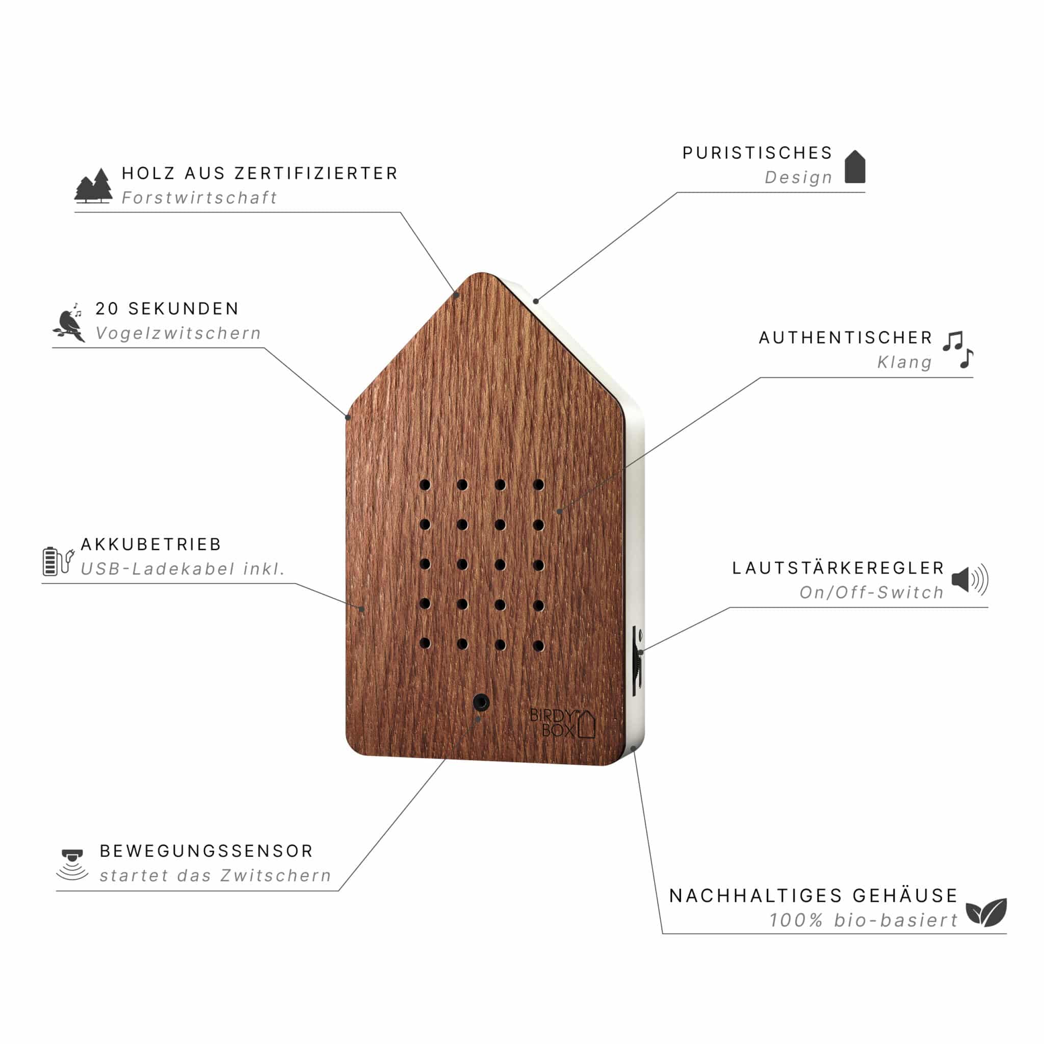 Het geluid is hetzelfde als de 2 bestaande Birdyboxen: Zebrano en Mat zwart. De Birdybox Eiken wordt opgeladen middels bijgeleverde USB-kabel. De Birdybox fluit 20 seconden en is iets kleiner dan de Zwitscherbox welke 120 seconden fluit en op 3 AA batterijen werkt. De levensduur van de batterij is ongeveer twee maanden, afhankelijk van het gebruik. Werkt niet bij schemering of duisternis. Het volume kan naar wens worden aangepast of volledig worden uitgeschakeld. De Birdybox kan overal worden geplaatst of aan de muur worden gehangen.