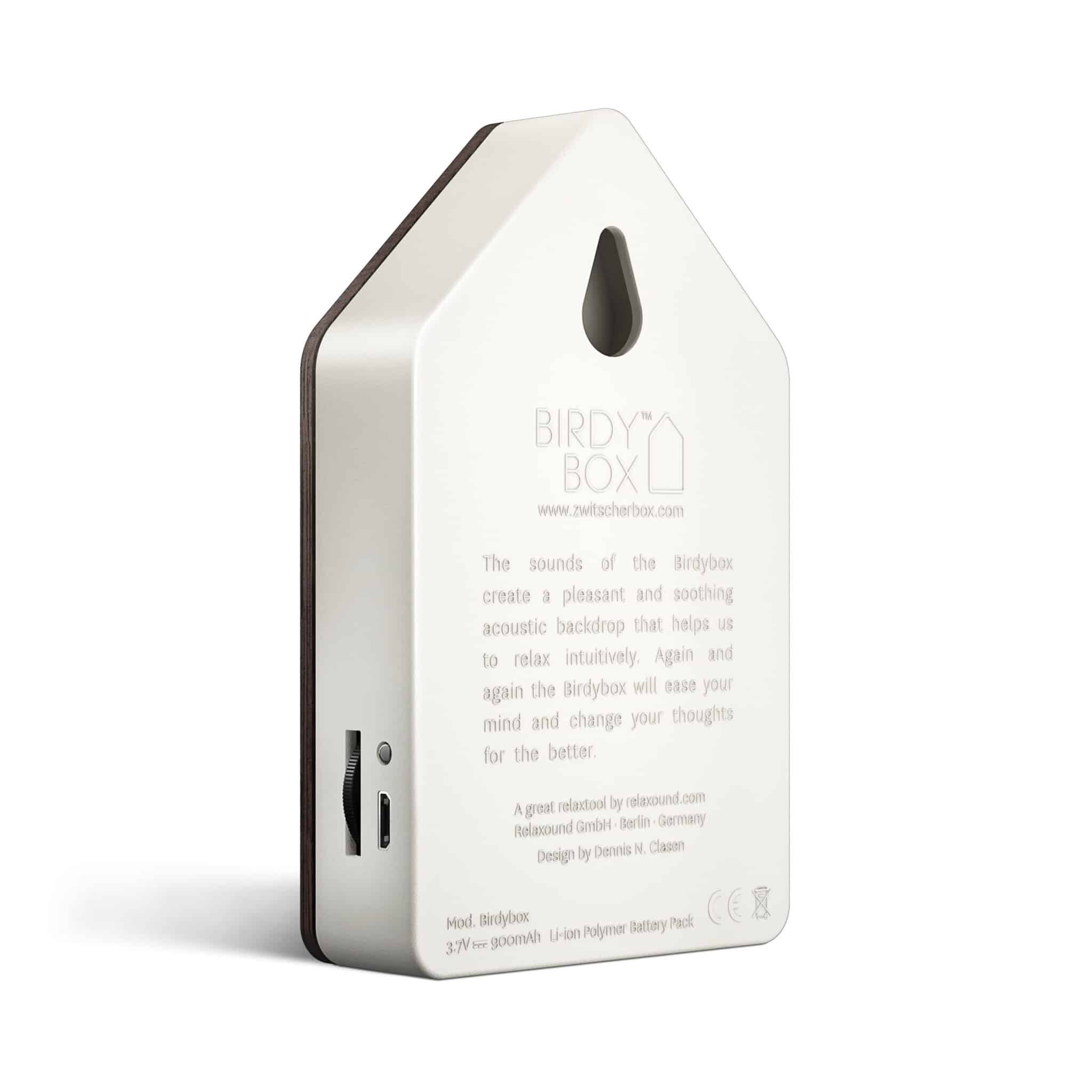 We verkopen ook de Zwitscherbox. Het verschil is: dat de vorm van de Zwitscherbox is vierkanter (wij vinden die vorm mooier). De Zwitscherbox speelt 120 seconden achter elkaar zonder tussendoor te activeren (sommige mensen vinden de 20 seconden van de Birdybox fijner, andere de 120 van de Zwitscherbox, de geluiden zijn hetzelfde, de geluiden van de Zwitscherbox zijn voor de Birdybox opgeknipt in 6 stukken van 20 seconden), De Birdybox is oplaadbaar, terwijl de Zwitscherbox op batterijen werkt. De Birdybox is gemaakt van 92% gerecycled materiaal en de verpakking zelfs van 100% gerecycled materiaal. De Zwitscherbox heeft dat (nog) niet. De witte achterkant van de Birdybox is daardoor ook niet spierwit.