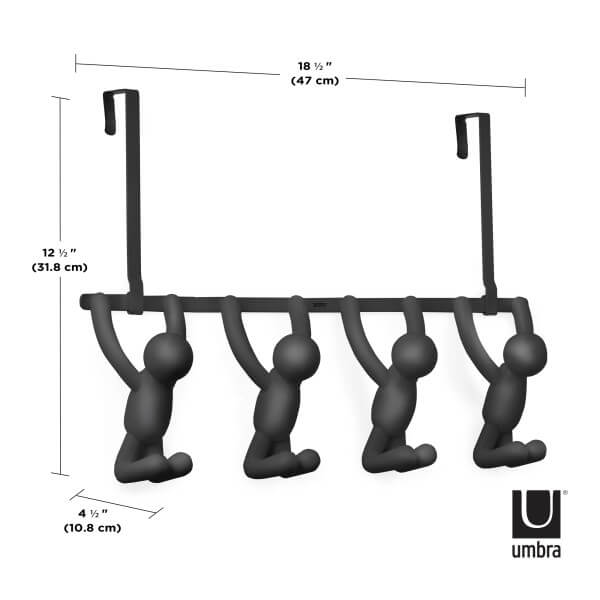 Buddy 4 Hook is een leuke aanvulling op je entree en een speels, ruimtebesparend alternatief voor een traditionele kapstok. Eenvoudig te volgen stapsgewijze instructies maken het installeren van uw Buddy 4 Hook eenvoudig. Het wordt geleverd met beugels om het over de deur en verborgen hardware te installeren als u het aan de muur wilt laten monteren. Buddy 4 Hook is verkrijgbaar in zwart of wit en meet 18,5 x 4,50 x 12,50 inch (46,99 x 11,43 x 31,75 cm).