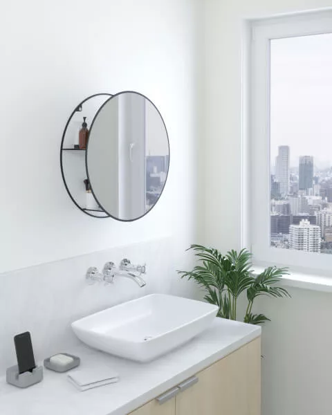 Verscholen achter deze grote ronde spiegel zijn twee verborgen metalen planken om netjes op te slaan uw benodigdheden. Gewoon grijpen en gaan, zonder de spiegel aan te raken of een kast te openen.