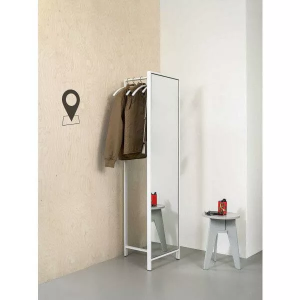 Plaats meerdere T-vormige rekken naast elkaar tegen de muur en creëer een half afgesloten garderobe.
