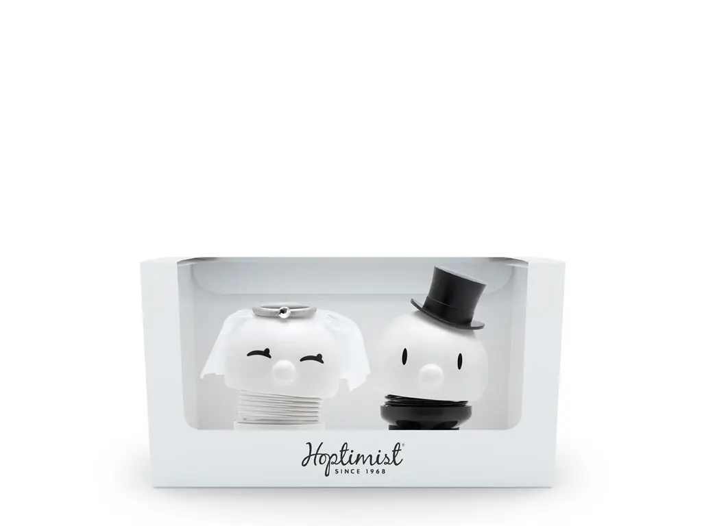 Hoptimist is door en door een stukje Deens design. Alle onderdelen worden geproduceerd en gebouwd in Denemarken. De kleine gelukkige Hoptimist brengt vreugde in elk huis, of je nu jong of oud bent. Hij past perfect in een etui of naast een vaas. Het Bruidspaar is goed als huwelijkscadeau of als versiering op de bruidstaart.