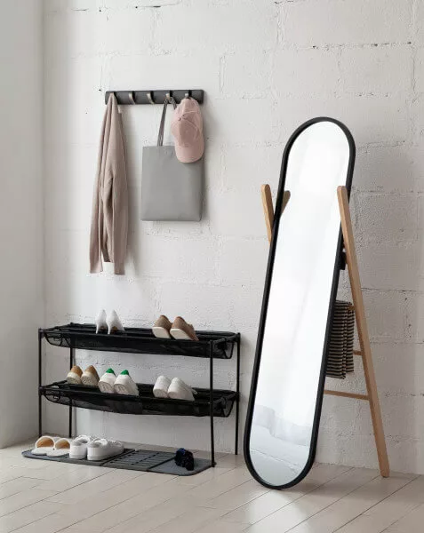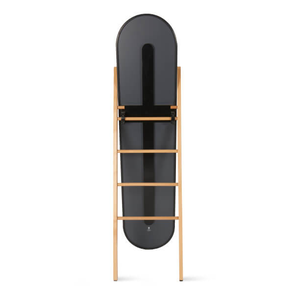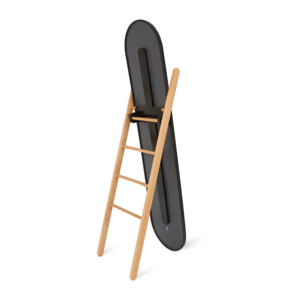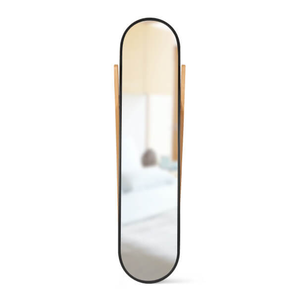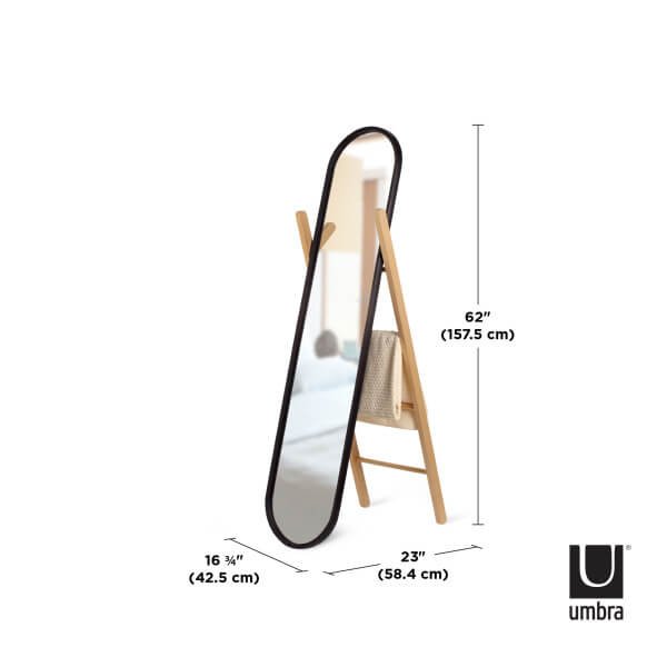 Umbra Hub-vloerspiegel met opbergrek, moderne zwarte rubberen rand en opbergladder van massief hout, zwarte/naturel afwerking