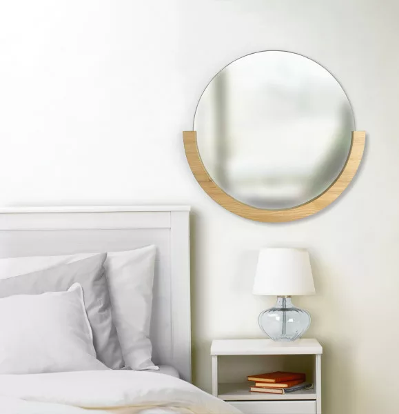 Als u op zoek bent naar een eigentijdse maar warme en gastvrije spiegel, is Mira misschien wel het ideale stuk wanddecoratie voor uw huis. Deze ronde spiegel heeft een houten halfrond frame met een natuurlijke houtafwerking. De bovenste helft van deze ronde spiegel is frameloos, waardoor het vermogen om toe te voegen aan de inrichting van de kamer wordt verbeterd zonder veel gewicht aan de muur toe te voegen. Mira ziet er geweldig uit als een spiegel van een poederkamer, in toegangen en slaapkamers, en is ook een uitstekend housewarming-cadeau omdat het meerdere decors biedt.
