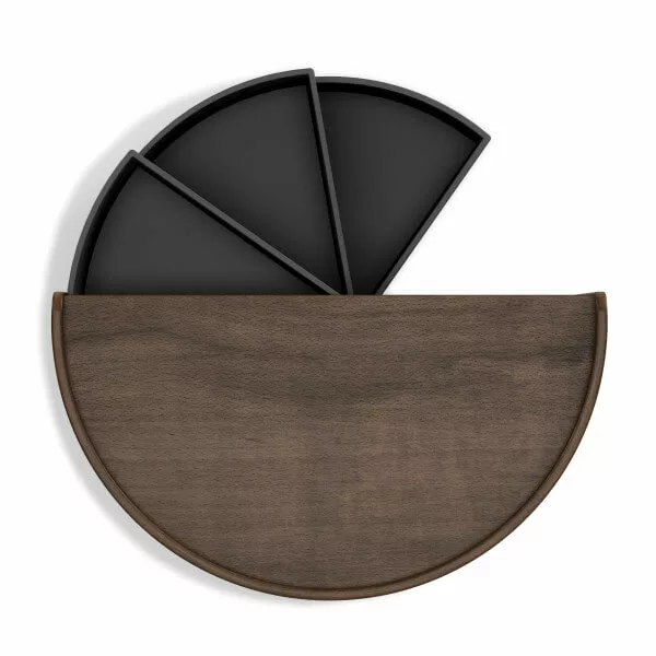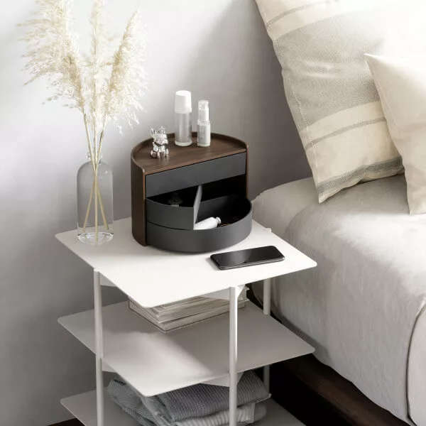 De nieuwe Umbra Moona sieradendoos heeft ronde vormen voor een unieke sieraden-organizer. Zowel decoratief als functioneel, heeft Moona een groot display dat ook dienst doet als dienblad voor kleinere accessoires, parfum of andere items. De drie roterende lades kunnen verborgen opbergruimte bieden of naar buiten worden geduwd voor gemakkelijke toegang. Met zijn unieke halve cirkelvorm en prachtige houtaccenten, is Moona een eyecather op uw kaptafel, nachtkastje, dressoir, bureau en meer.
