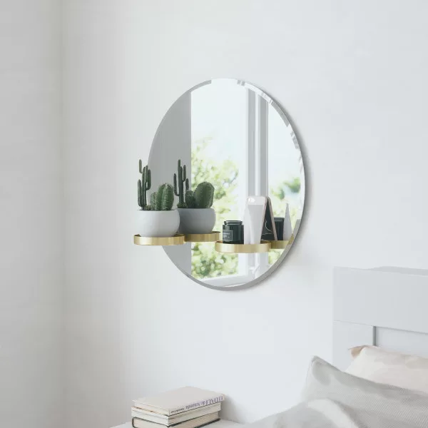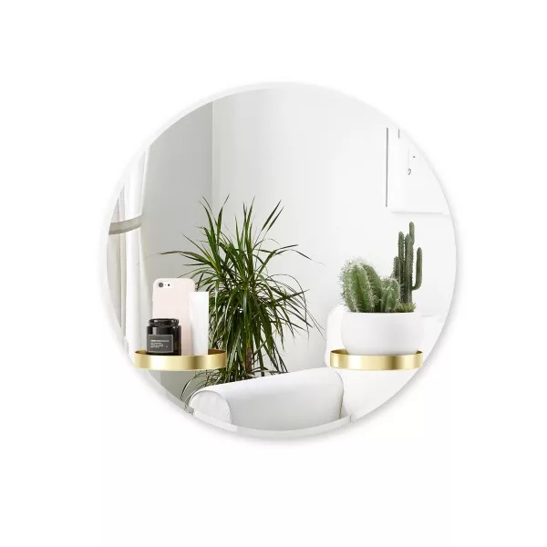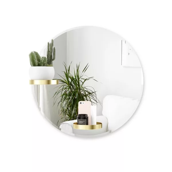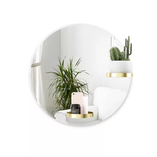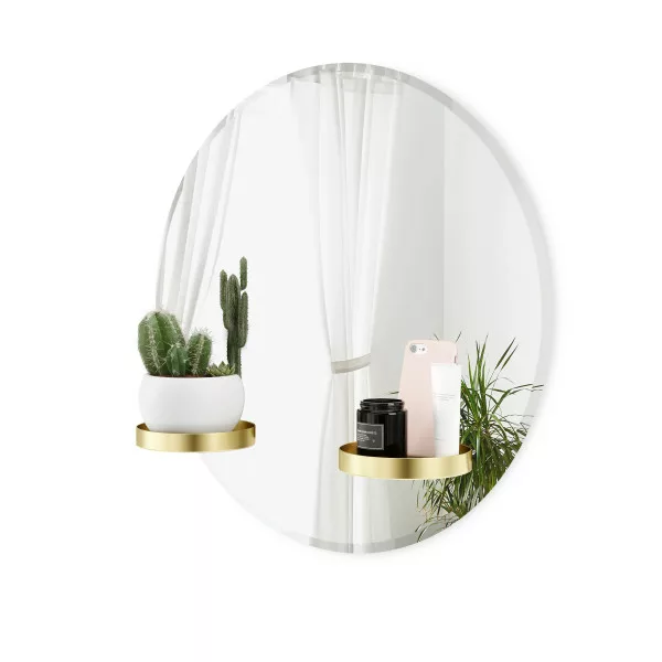 De 61 cm hoge ronde wandspiegel Perch heeft een gepolijst frame en twee ronde messing planken. Deze unieke wandspiegel is zowel een decoratief stuk als een praktische plank voor aan je muur. De twee planken kunnen op 5 verschillende plaatsen aan de spiegel worden bevestigd.