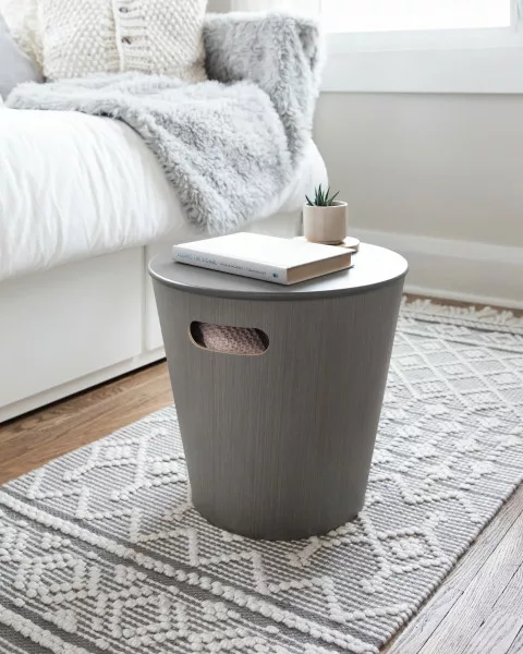 Woodrow is een eigentijdse en slanke kijk op de typische poef met zijn prachtige, natuurlijke houtafwerking en geometrische vorm, gemaakt van behandeld hout, gebogen in een taps toelopende cilindrische vorm. Het afneembare deksel functioneert als zowel een tafelblad als een stoel, en de geïntegreerde handgrepen maken het gemakkelijk om door het huis te bewegen. Dit stuk meet 16,5 x 15,8 inch, zodat het netjes grotere huishoudelijke artikelen zoals dekens kan opslaan.